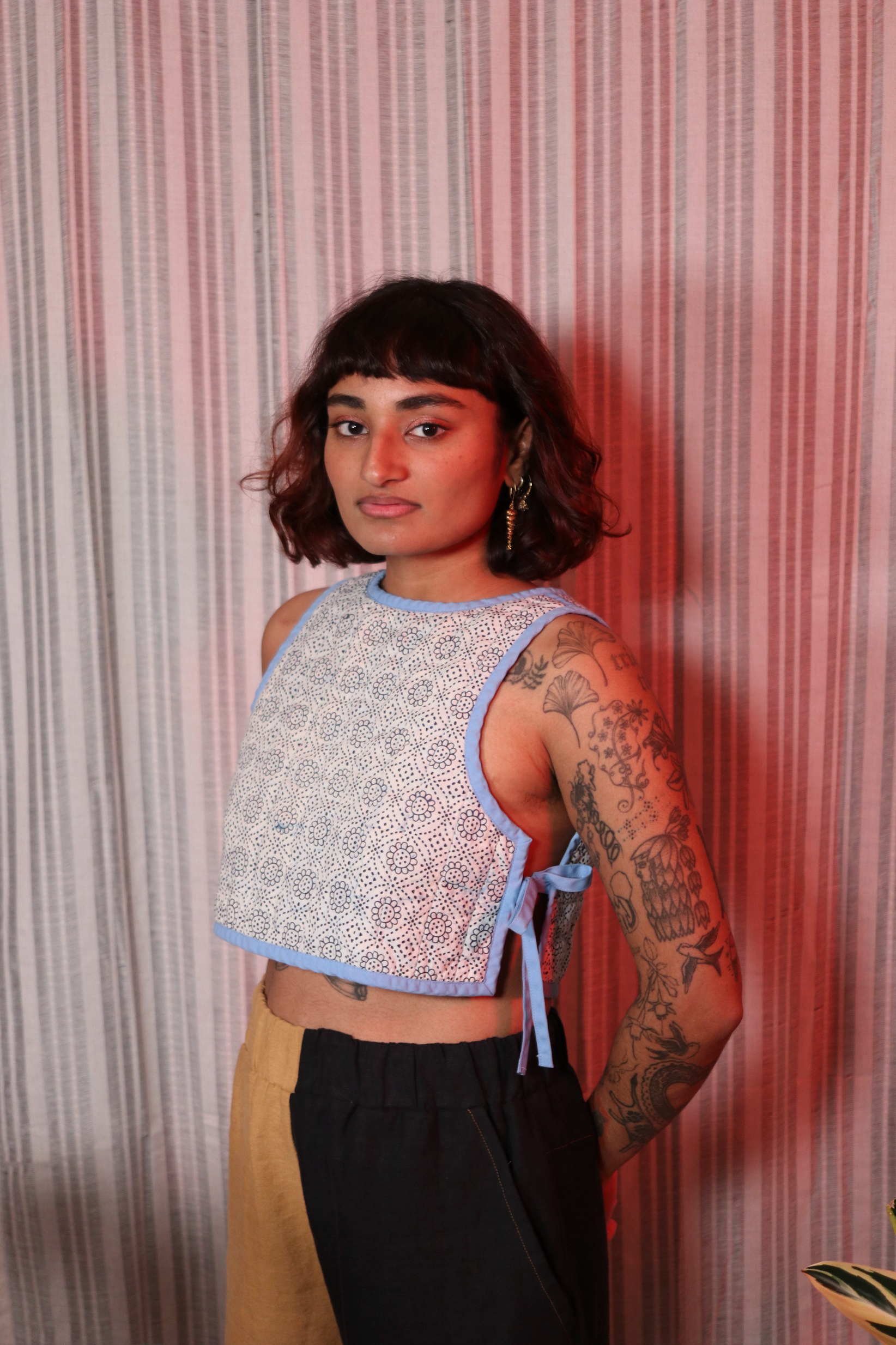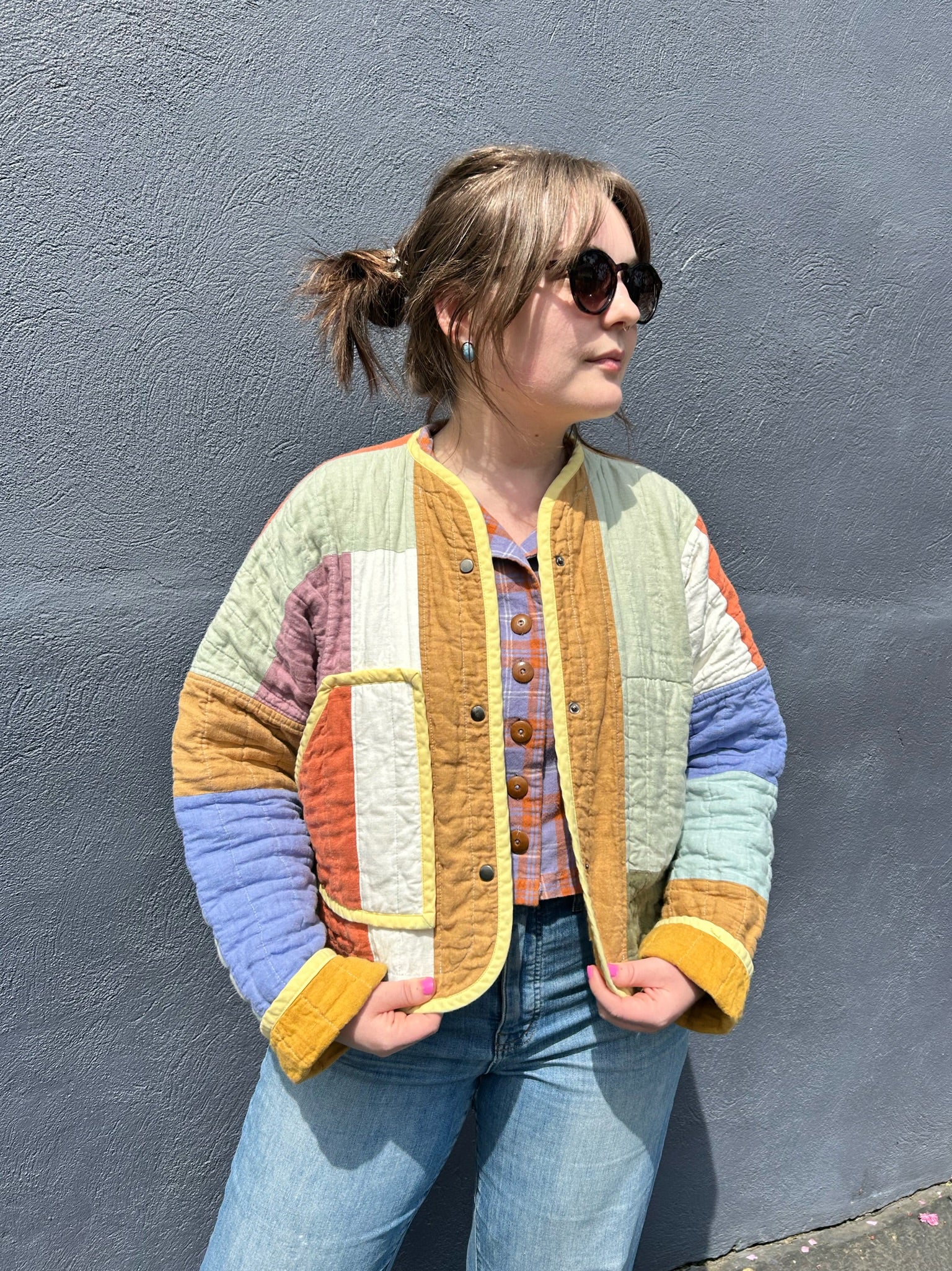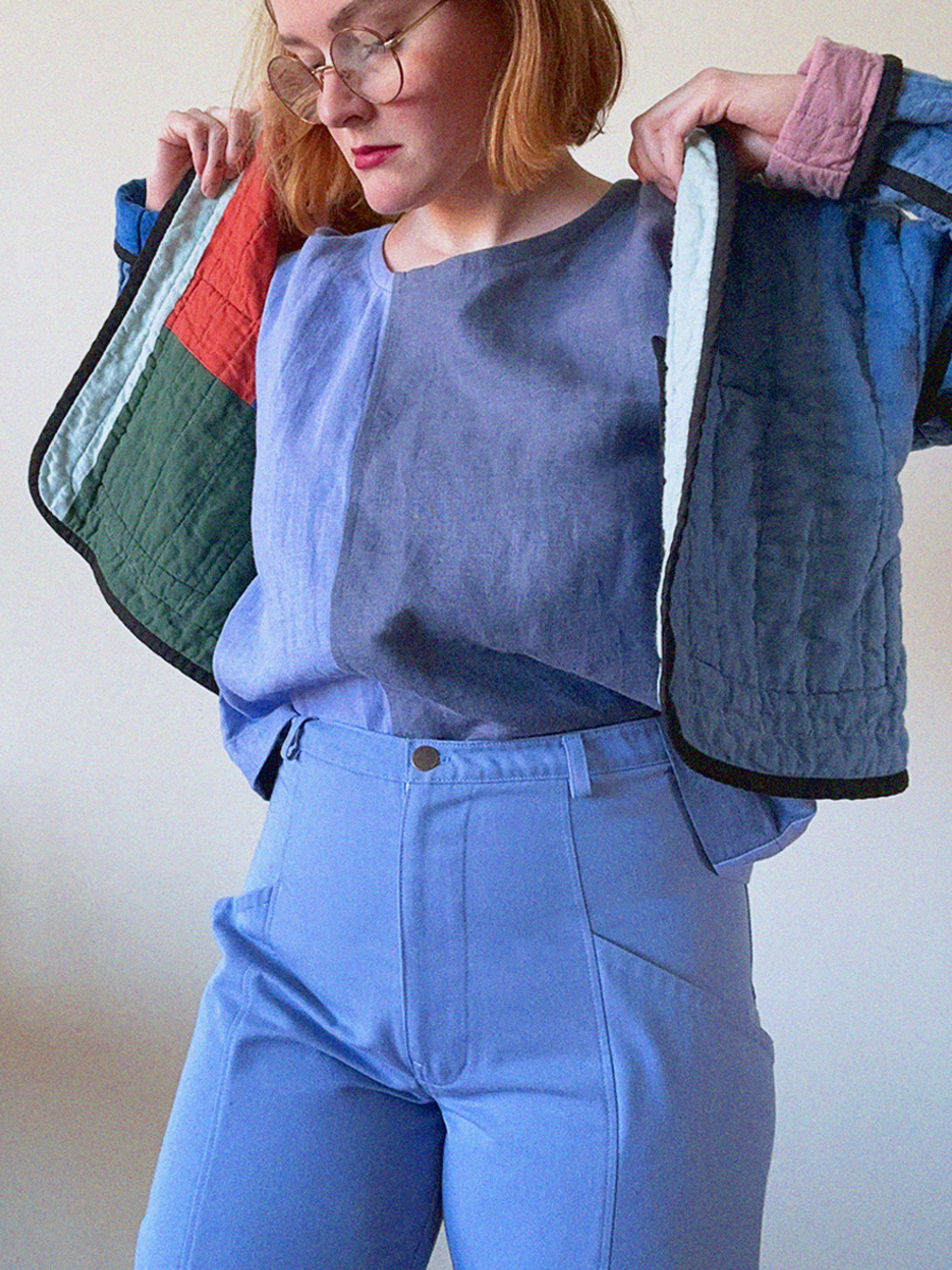 janani is 5’ 3” & wears size S in most garments. they are pictured here in a S quilted vest and S home pants.